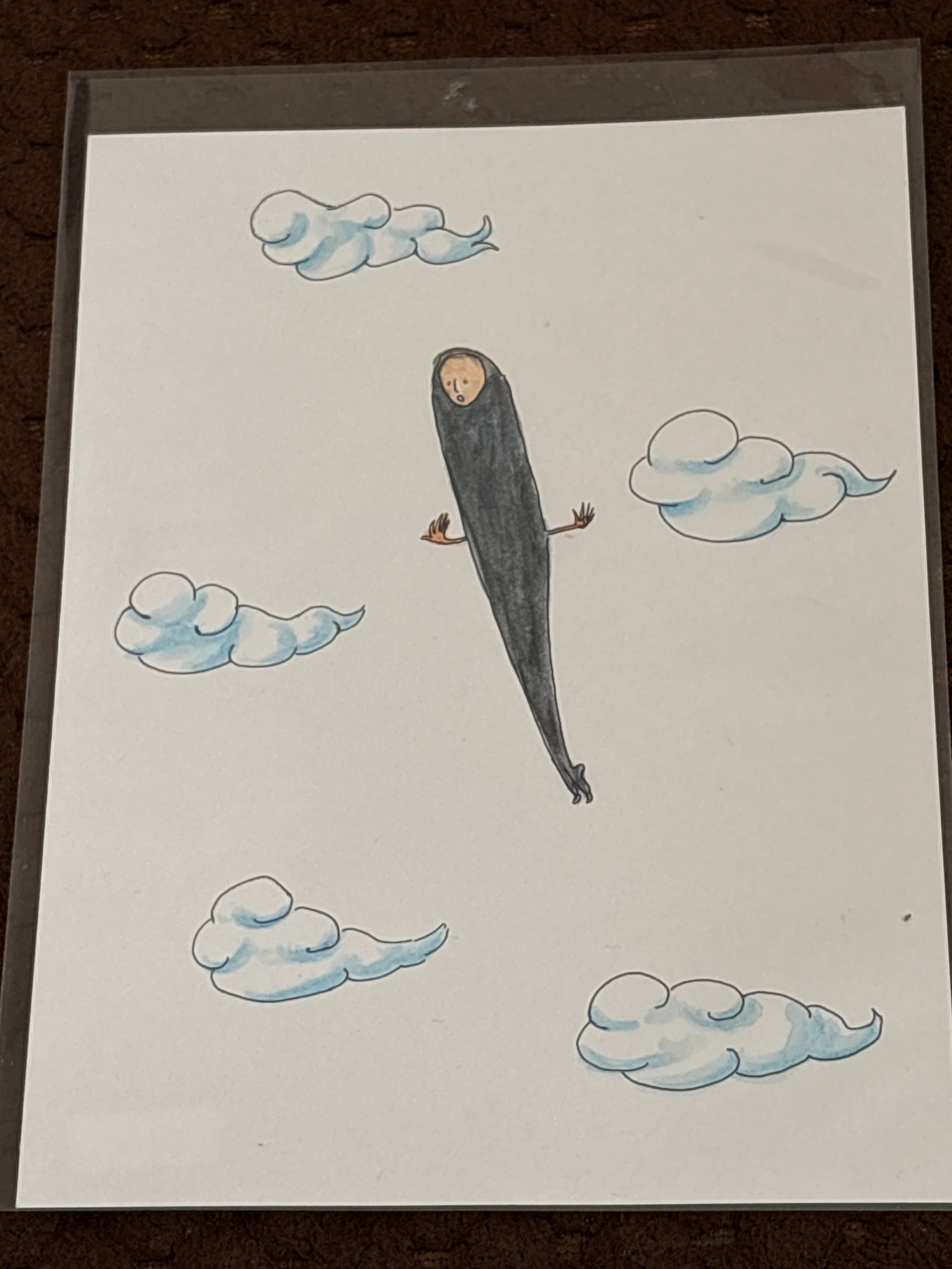 マルマンの薄口タイプの水彩画用紙B6サイズに、ボールペンと水彩色鉛筆で描いています。