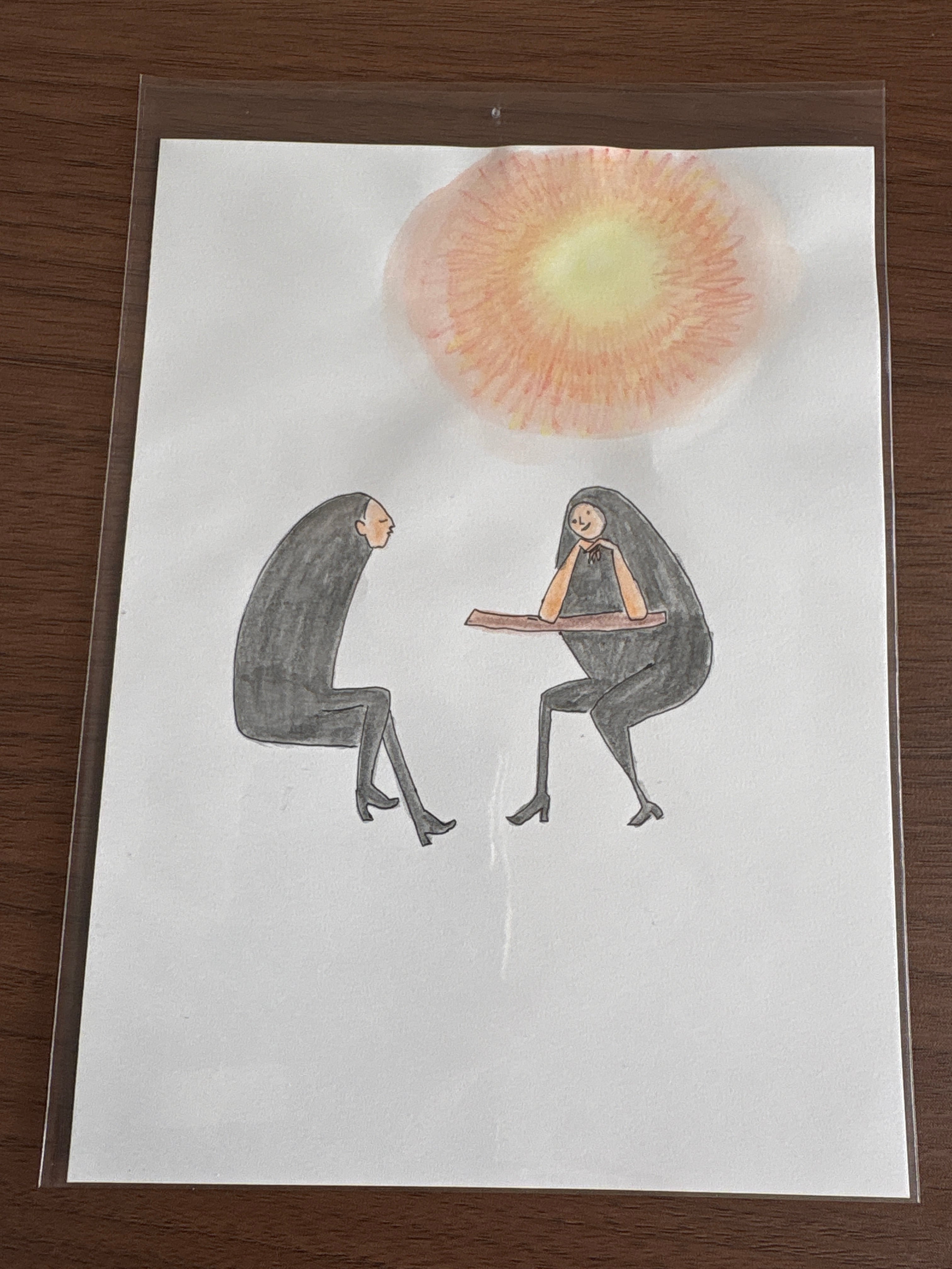 マルマンの薄口タイプの水彩画用紙B6サイズに、ボールペンと水彩色鉛筆で描いています。