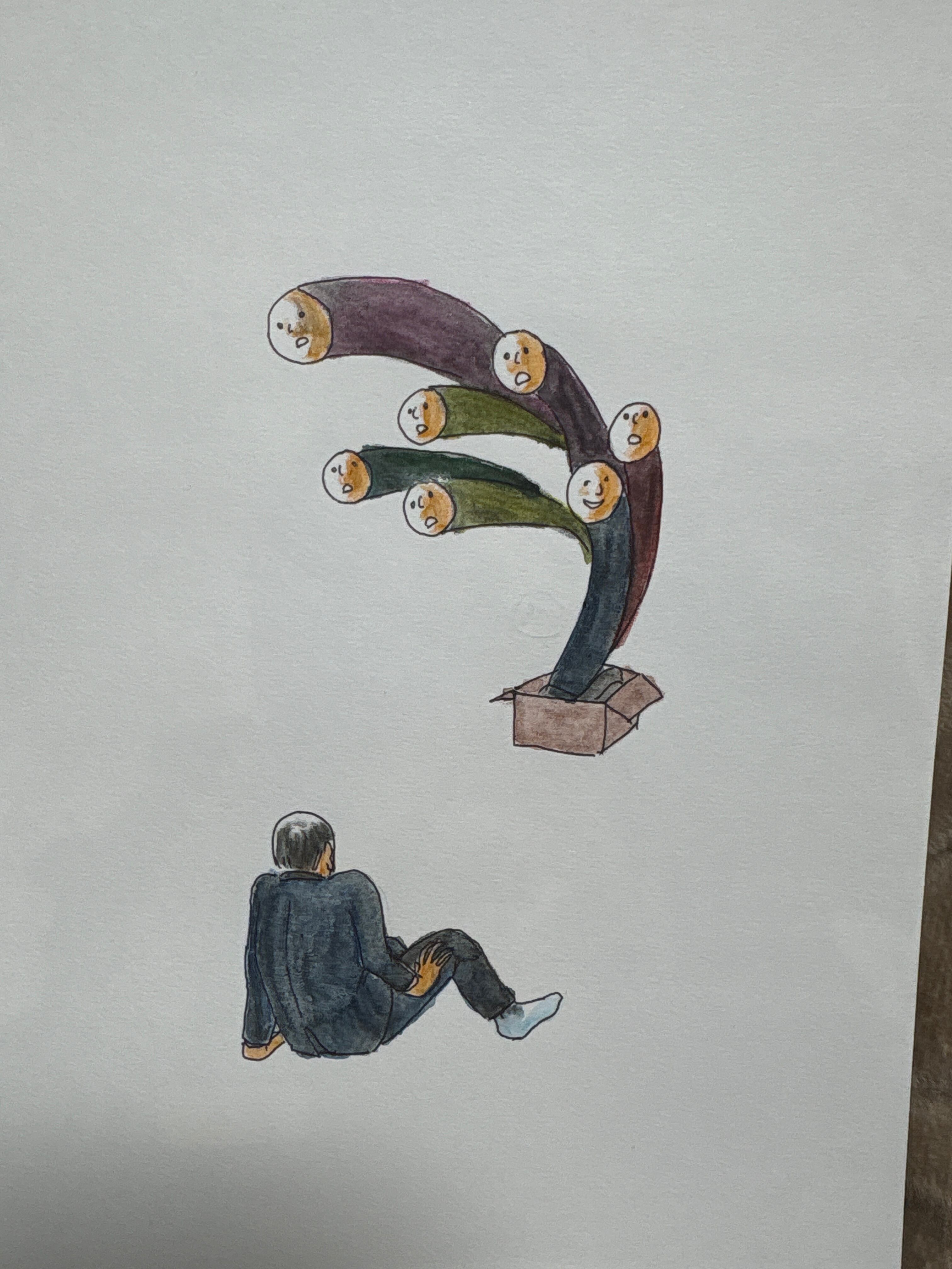 マルマンの薄口タイプの水彩画用紙B6サイズに、ボールペンと水彩色鉛筆で描いています。