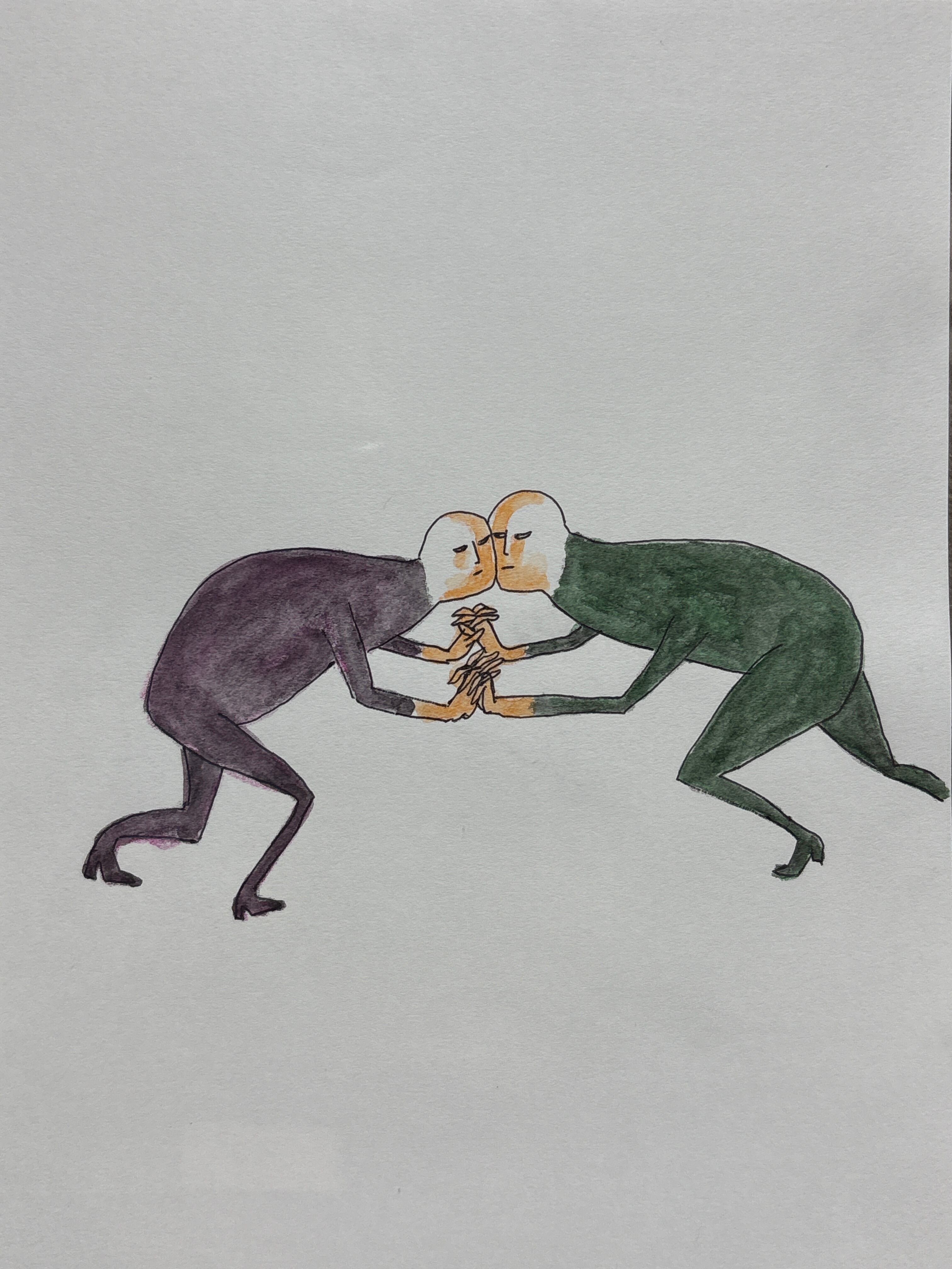 マルマンの薄口タイプの水彩画用紙B6サイズに、ボールペンと水彩色鉛筆で描いています。