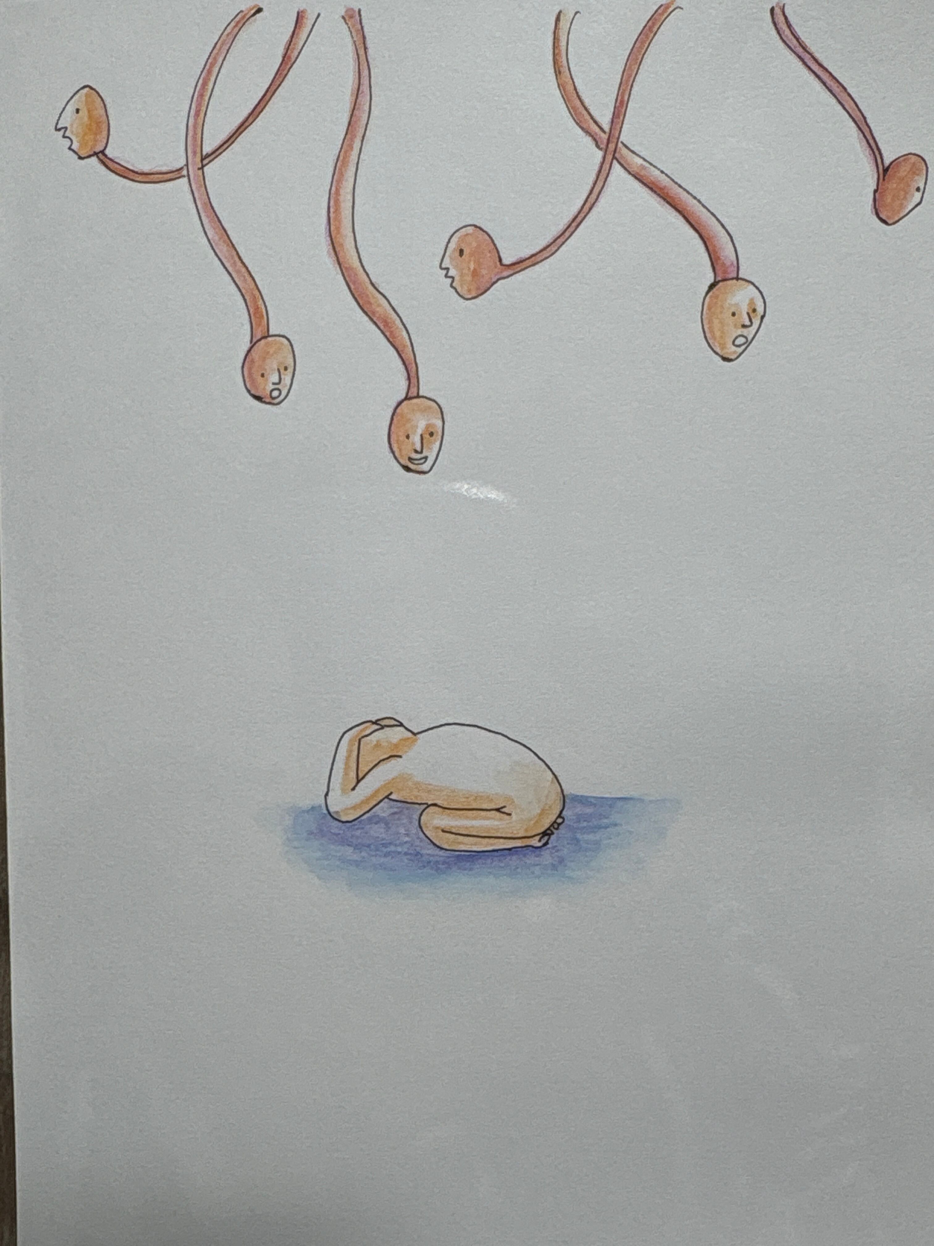 マルマンの薄口タイプの水彩画用紙B6サイズに、ボールペンと水彩色鉛筆で描いています。