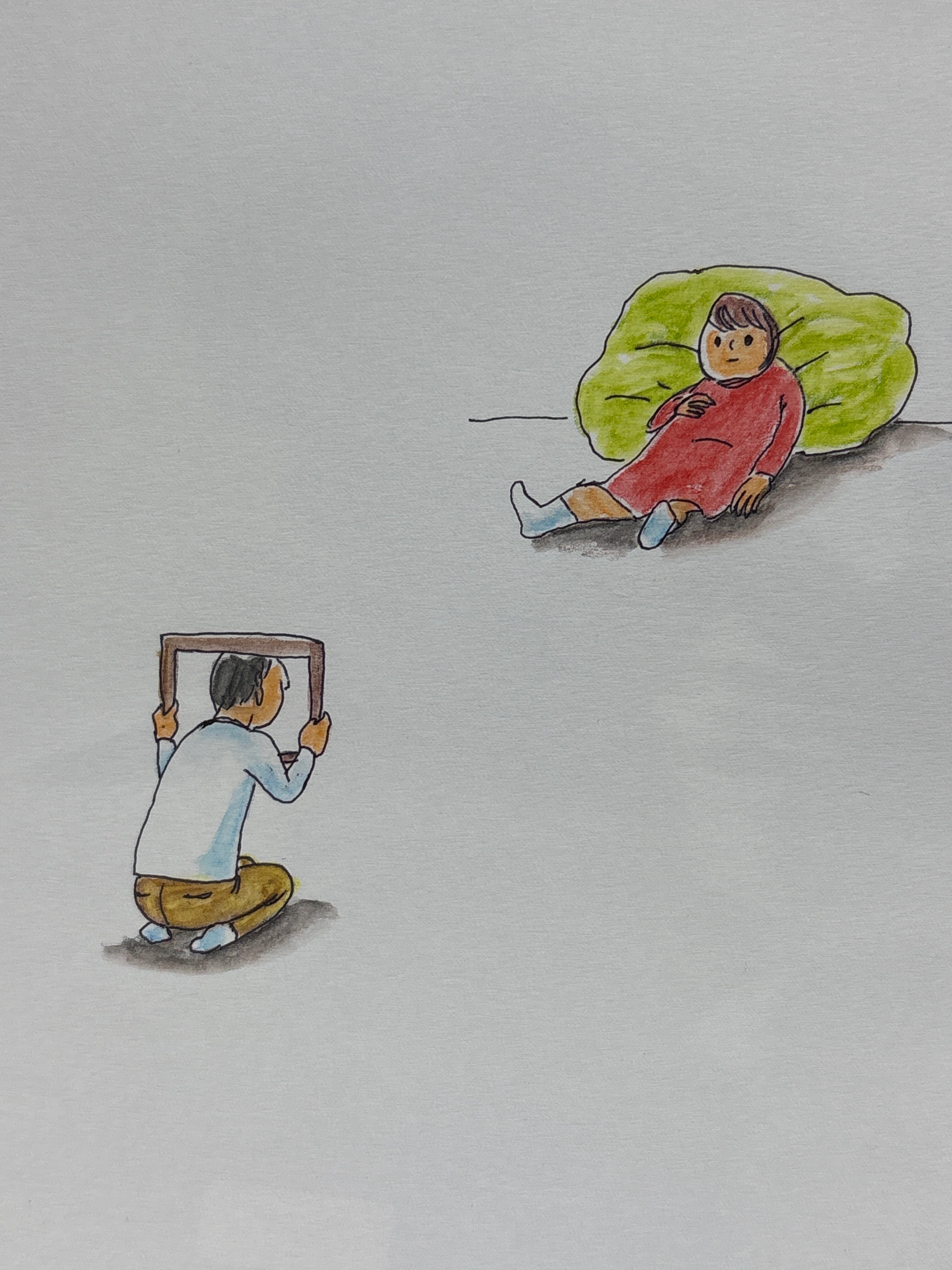 マルマンの薄口タイプの水彩画用紙B6サイズに、ボールペンと水彩色鉛筆で描いています。