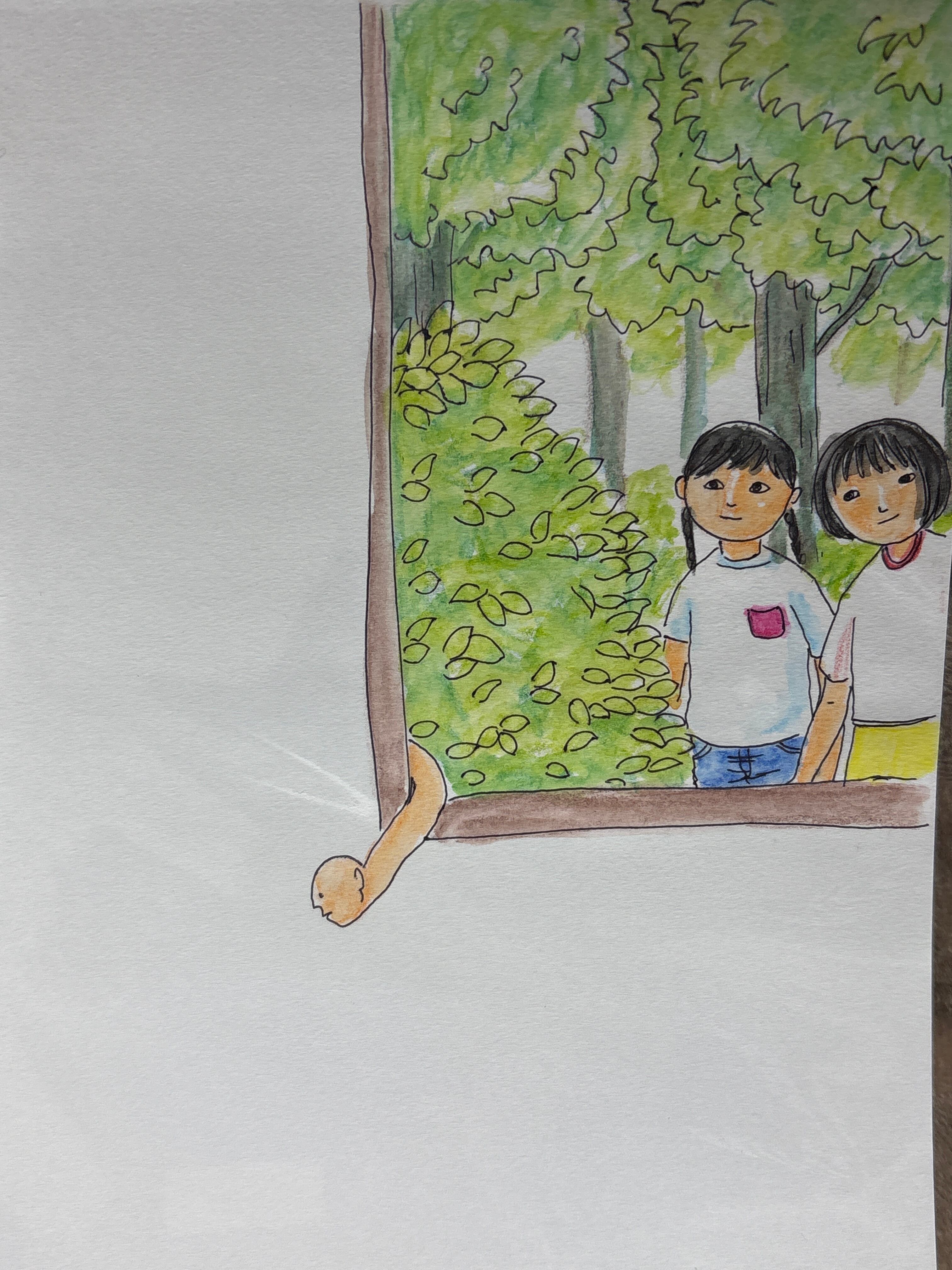 マルマンの薄口タイプの水彩画用紙B6サイズに、ボールペンと水彩色鉛筆で描いています。