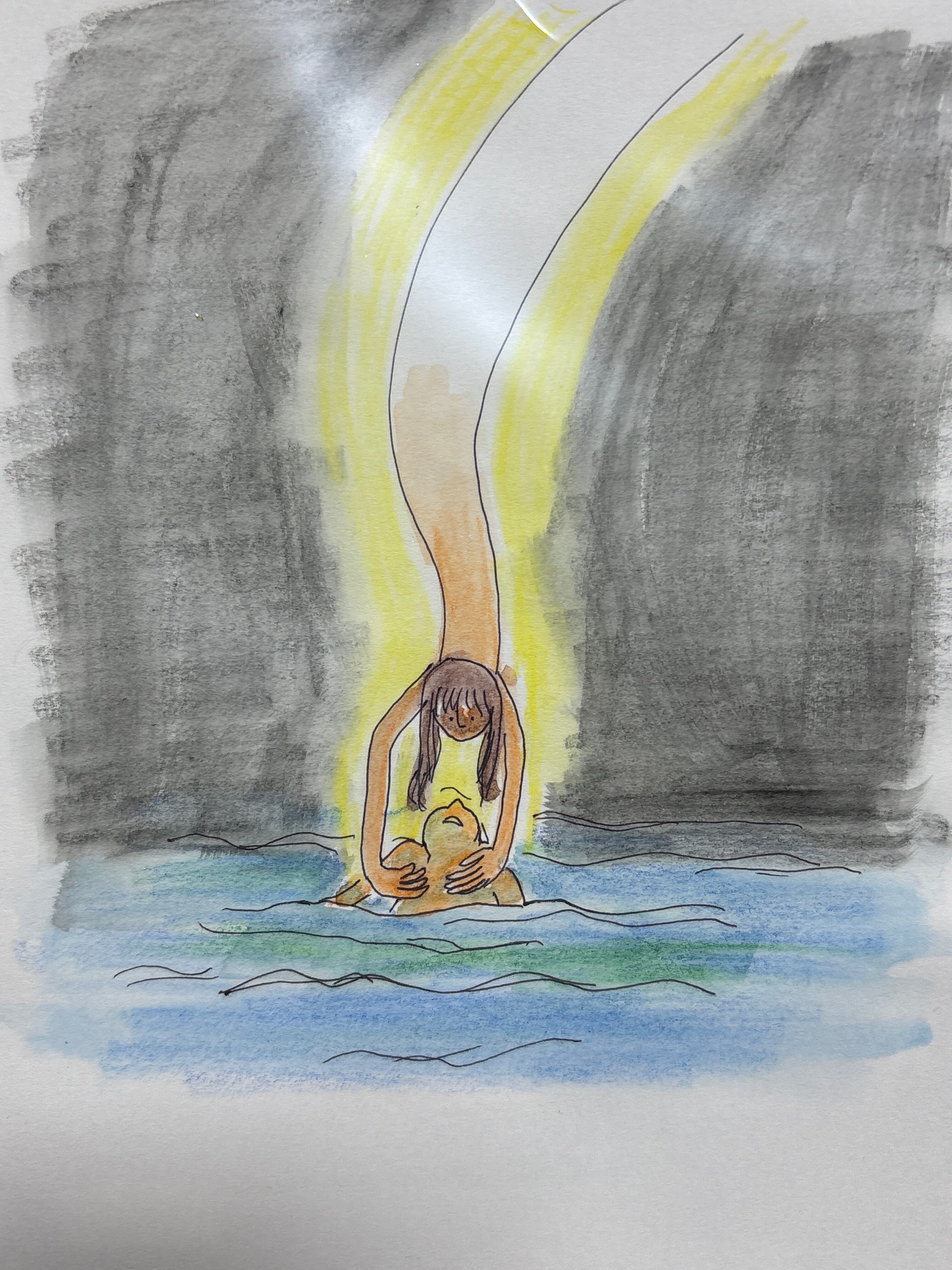 マルマンの薄口タイプの水彩画用紙B6サイズに、ボールペンと水彩色鉛筆で描いています。